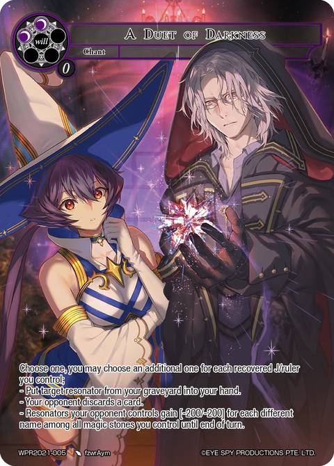 - Resonators your opponent controls gain [-200/-200] for each different name among all magic stones you control until end of turn.