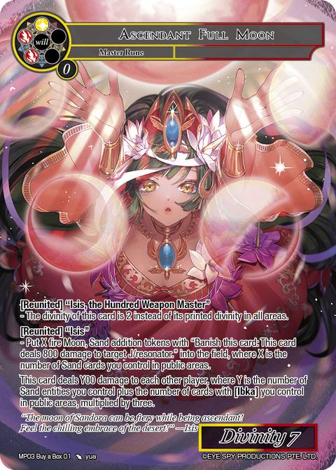 //deck-1 4 Dark Alice, Rabbit Princess 4 Isis, Flower of the Desert 4 Snake of Scorching Sand 3 Sphinx of the Godlike Sands 3 Surtr, the Sand Giant 2 Sand Dragon 3 Laurite, Seven Luminaries Astrologian 2 Kushiel, Archangel of Punishment 2 Corrupted Courtesans of the Light Palace 4 Thousand Fractured Reflections 2 Ki Lua: Fossil Girl in the City 2 A Flashing Smile 2 A Duet of Light 2 Final Breeze 1 Demon's Blood 2 Amon's Collar of Punishment //play-1 1 Isis 1 The Seven Children of Serqet //sideboard-1 1 Rogue Spectator 1 Fire Pit Trap 1 Replicant: Shiva 1 An Unfavorable Exchange of Wealth 4 Alabaster Spellweaver Shaman 3 Magmatic Steed 2 Resurrected Epiphanic Priests 2 Hellfire of the Demonic World //deck-2 4 Light Moon Fragment 2 Magic Stone of Remnants 2 Magic Stone of Moon Shade 1 Magic Stone of Blasting Waves 1 Magic Stone of Gusting Skies //pile-facedown 1 Prideflame Glyph 1 Ascendant Full Moon 1 Poison Stinger 1 Quadruple Draw Swordsman's Technique 1 Demon's Blood