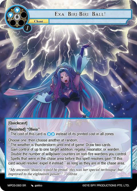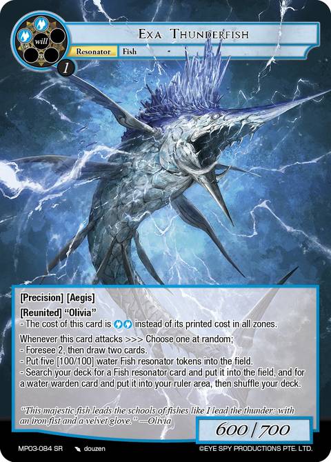 //deck-1 2 Dolly, Olivia's Electric Dolphin 4 The Thunder Empress's Strike 4 Olivia, Greedy Empress of the Sea 1 Brad, Gluttony of the Six Sages 1 Exa Thunderfish 1 Exa Biri-Biri Ball! 1 Tera Thunderfish //play-1 1 Olivia, Thunder Empress 1 Olivia, Thunder Empress [J-Ruler] 1 Those Who Assaulted Yomidgard //sideboard-1 1 Replicant: Shiva 1 Engraved Rune of the Setting Sun 1 An Unfavorable Exchange of Wealth