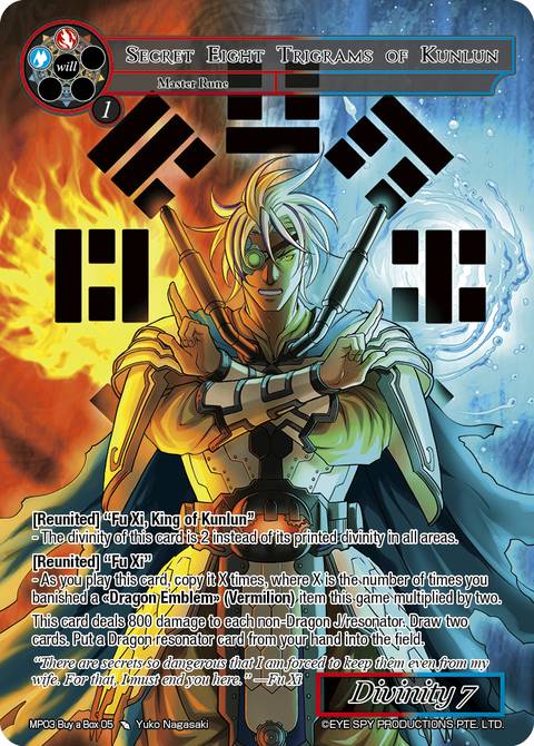 //maindeck 1 Lady Nüwa, Beloved Queen of Kunlun 1 Fu Xi 4 Lady Nüwa's Karakuri Steam Dragons 4 Fu Xi, Steamforge Dragonlord 3 Eight Trigrams of Kunlun 4 Zhenwu, Dragonborn Lord 4 Tiny Fire and Water Dragon 4 Scholar of the Sunken Nation 4 Dragon Flame Enters the Game of Gods 2 Arena Expansion: Valley of the Dragons 3 Supercalifragilisticexpialidocious Flame 4 Mechanized Blade Dragon 2 Lord of Vermilion 2 Elektra's Training 1 Fumaroles of Infernal Bloodlava 1 Fragment of the Emerald Tablet 4 Magic Stone of Vaporization 4 Magic Stone of Hearth's Core //extra-deck 1 Farewell Smile 1 Hindered Magic Duel 1 Secret Eight Trigrams of the Kunlun 1 Sand Awakening 1 Flame Dragon Summoning //sideboard 1 Rogue Spectator 1 Fire Pit Trap 2 Replicant: Genshi Tenson 1 Supercalifragilisticexpialidocious Flame