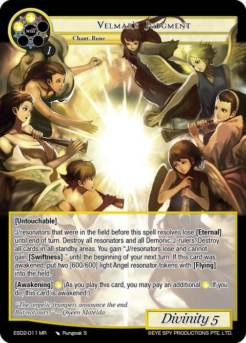 //deck-1 4 Knight-Captain of Velmardia 3 Knight of the Setting Sun, Lionel 3 Elite Swordsman of Velmardia 3 Defenders of the Lower Plateau Wall 2 Raymond, Member of the Twelve Sacred Knights 2 Spirits of the Crimson Moon 2 Kushiel, Archangel of Punishment 1 Pusiel, Archangel of Purity 2 Hyde, Shooting Star of Light 3 Battle Wolf of the Crimson Moon 2 Corrupted Courtesans of the Light Palace 3 Protection of the Academy Grounds 1 Envoy of the Goddess, Hutriel 2 Lunar Protective Lifeform 3 Thousand Fractured Reflections 3 L, Tracker 1 Makoto Cloth Corps' Songstress //play-1 1 Queen of Velmardia, Matelda //sideboard-1 1 Engraved Rune of the Setting Sun 3 Zero's Light Lightning 3 Makoto Cloth Corps' Ritualist 2 Sphinx of the Godlike Sands 1 Velmar's Judgment 2 Accursed Ice Shards 2 Alabaster Spellweaver Shaman 1 Replicant: Shiva //deck-2 2 Magic Stone of Chrysoberyl 2 Magic Stone of Remnants 1 Vestige of Velmardia's Grace 4 Magic Stone of Gusting Skies 1 Magic Stone of Heat Ray //pile-facedown 1 Taking Attendance 1 To Arms! 1 Sealed Glyph of Infinite Loop 1 Barrier of Unsullied Hope 1 Demon's Blood