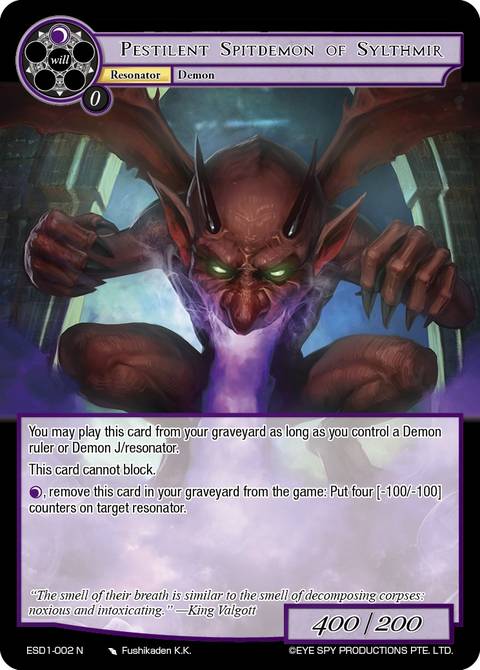 //deck-1 4 Demon Bet Collector 3 Thir'ahmh's Pack of Hounds 3 Dorian, Heartless Aristocrat 3 Malevolent Abomination of Sylthmir 3 Demon of the Crimson Moon 2 Neithardt, Guardian of Diabolos' Labyrinth 2 Relentless Tormenting Demon 2 Vacuus, Member of the Twelve Sacred Knights 3 Zacky's New Plan! 2 One Hit K.O. Anaesthesia 2 Statue Of The Misty Dragon 1 Soul Absorption 2 Laboratory of Blessing 2 Accursed Ice Shards 2 Raven's Order's Professor, Morgana 2 Grendel, Suffocating Spitdemon Lord 2 Pestilent Spitdemon of Sylthmir 2 Wicked Cryptid Elite Guard //play-1 1 Immortal King of Sylthmir, Valgott //sideboard-1 1 Fire Pit Trap 2 Putrid Symbol of the Lord of Flies 4 Protection of the Academy Grounds 2 Valgott's Secret Surveillance 2 Confrontation with Varkuzhal //deck-2 3 Gleaming Obsidian Skull 3 Magic Stone of Sympathy 4 Remains of Attoractia //pile-facedown 1 Glyph of Neverending Hatred 1 Desperate Pact 1 Engraved Rune of Motionless Freeze 1 Sealed Glyph of Infinite Loop 1 To Arms!