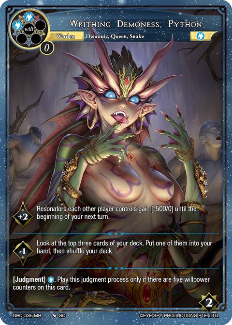 //deck-1 3 Sealed Glyph of Infinite Loop 4 The Arrival of the Conqueror 3 Academy City's Expert Therapist 1 Protection of the Academy Grounds 4 The Price to Pay 1 Fates Reunited! 4 Hi-Speed Uppercut Treatment 4 Thousand Fractured Reflections 3 Writhing Demoness Python 1 Poisonous Book of Python 3 Python's Suffocating Bracers 3 Vacuus, Member of the Twelve Sacred Knights 4 Maiden of Sorrow 2 Cauldron of Necrotic Elixir //play-1 1 Seeker of the Excessive, Caelth 1 Eternal Pact with Python //deck-2 1 Vestige of Velmardia's Grace 1 Resin Drop of the Fallen Tree 3 Wind Moon Fragment 2 Darkness Moon Fragment 3 Secret Stone of the Ethereal Moon //pile-facedown 1 Demonic Glyph of Corroding Envy 1 Sealed Glyph of Infinite Loop 1 Glyph of Scarring Divination 1 Forbidden Experimentation 1 Valgott's Secret Surveillance 1 Engraved Rune of Motionless Freeze